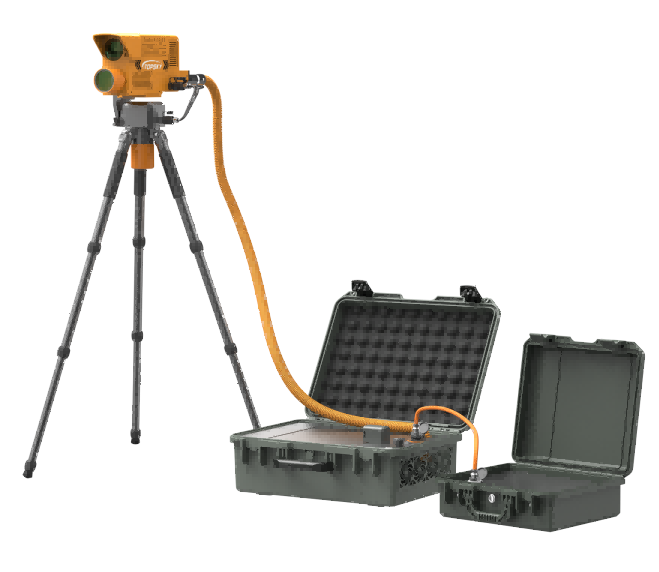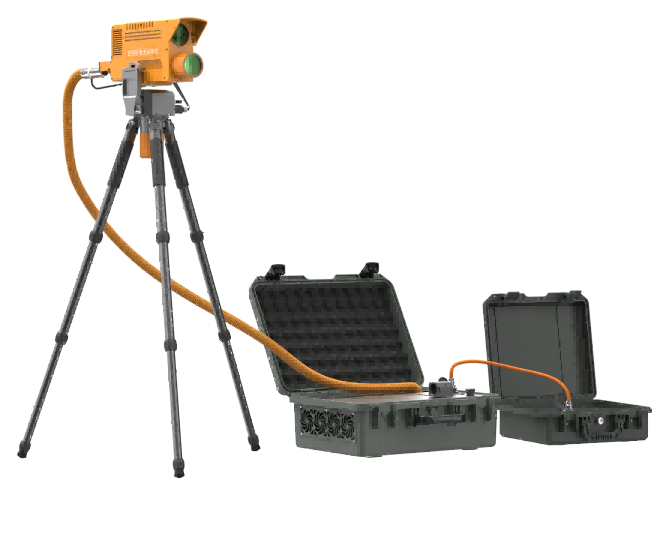 光学破拆装置内置高能光纤激光器,能够从地面发射激光对钢板、铝板、钢筋、彩钢瓦、树木、塑料、马蜂窝等进行远距离切割清除。