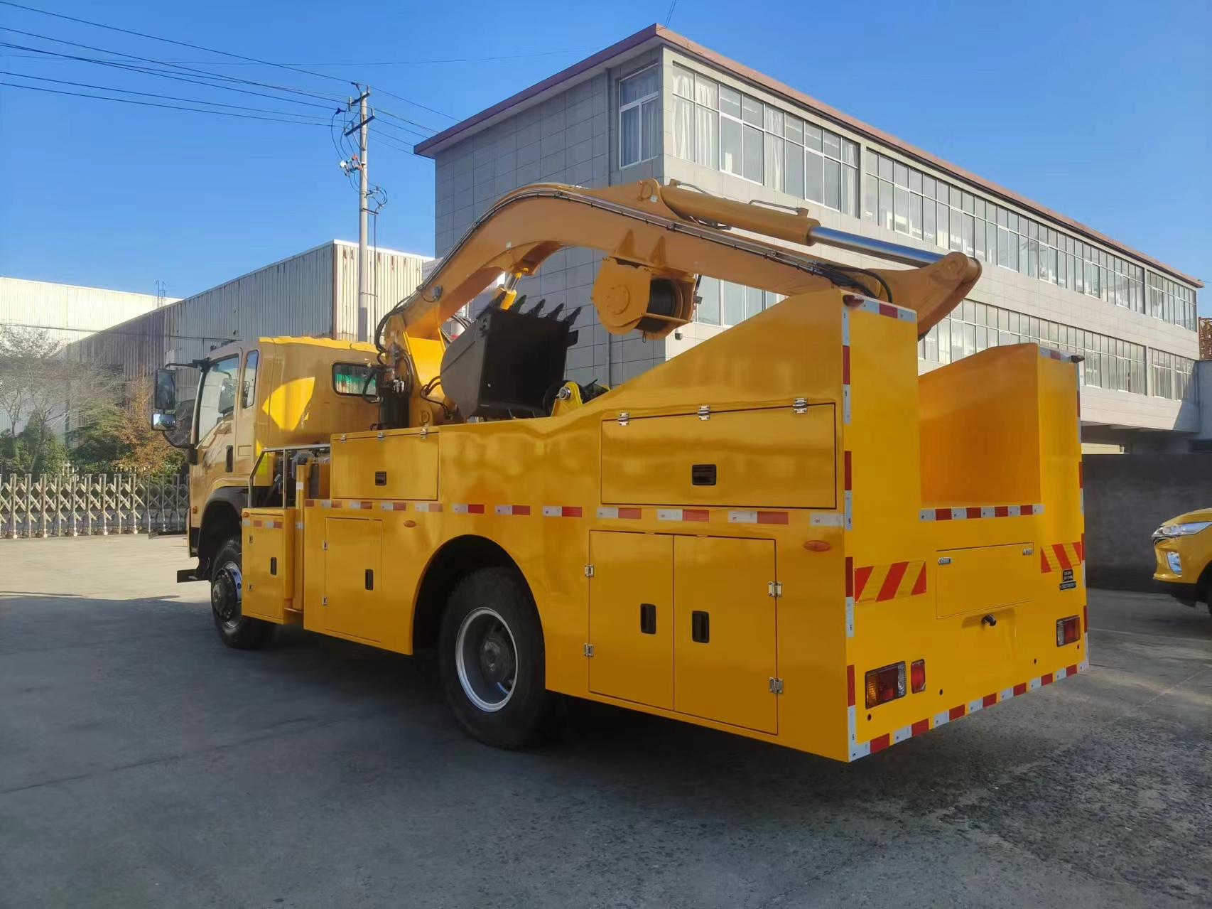 车辆配备举升臂架、挖斗、破拆锤、抓斗、推铲、牵引绞盘、发电机组、升降照明灯等抢险装备,实现多种场景的救援作业;
