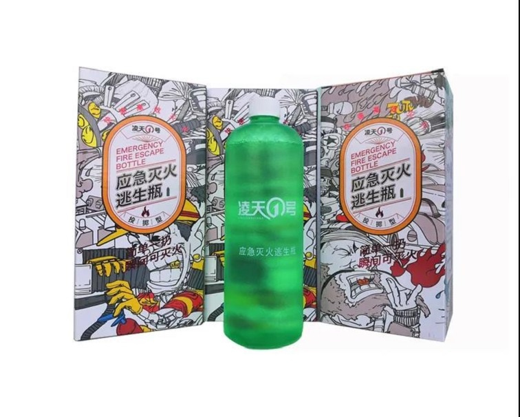 应急逃生灭火瓶为灭火剂装于环保可降解的特殊树脂瓶中,只需投掷于火源中,灭火瓶触碰到物体即可破碎,灭火剂会从破裂的瓶中瞬间散布出来, 在燃烧物表面流散的同时液体冷却其表面,并在燃烧物表面上形成一层水膜与泡沫层共同封闭燃烧物表面,隔绝空气,形成隔热屏障,吸收热量后的液体汽化并稀释燃烧物表面上空气的含氧量,对燃烧物体产生窒息作用,阻止了燃烧的继续;同时,该灭火剂与燃烧物质发生化学反应,形成聚合物质,该聚合物质能有效地抑制或降低燃烧自由基的产生,破坏燃烧链,阻止燃烧.  应急逃生灭火瓶是一种多功能、高效、环保、无毒、可100%自然降解的植物型初期火灾灭火剂,由生物高分子聚合物、碳氢表面活性剂、阻燃剂、稳定剂、助剂等多种成份组成的环保型灭火剂,以扑灭A、B、E、F类初期火火灾。