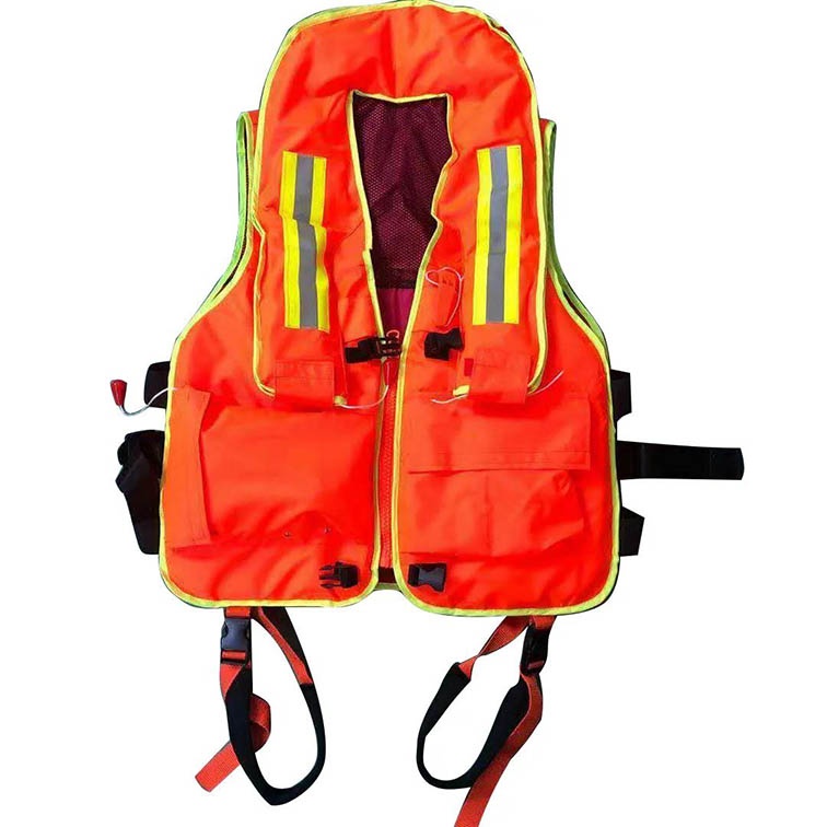 消防专用救生衣由背心式救生衣体、救生衣气囊、气胀式救生圈、辅件及属具组成。背心式救生衣体由固有浮力材料及包布组成。救生衣辅件主要包括拉链、敷带、反光带、搭扣及挂环等,其中敷带包括裆带和收紧带。