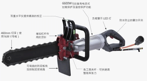 配备了6600W高频永磁同步马达的水泥链锯,非常适用于大深度切削和无过度切削的精确切角!