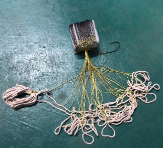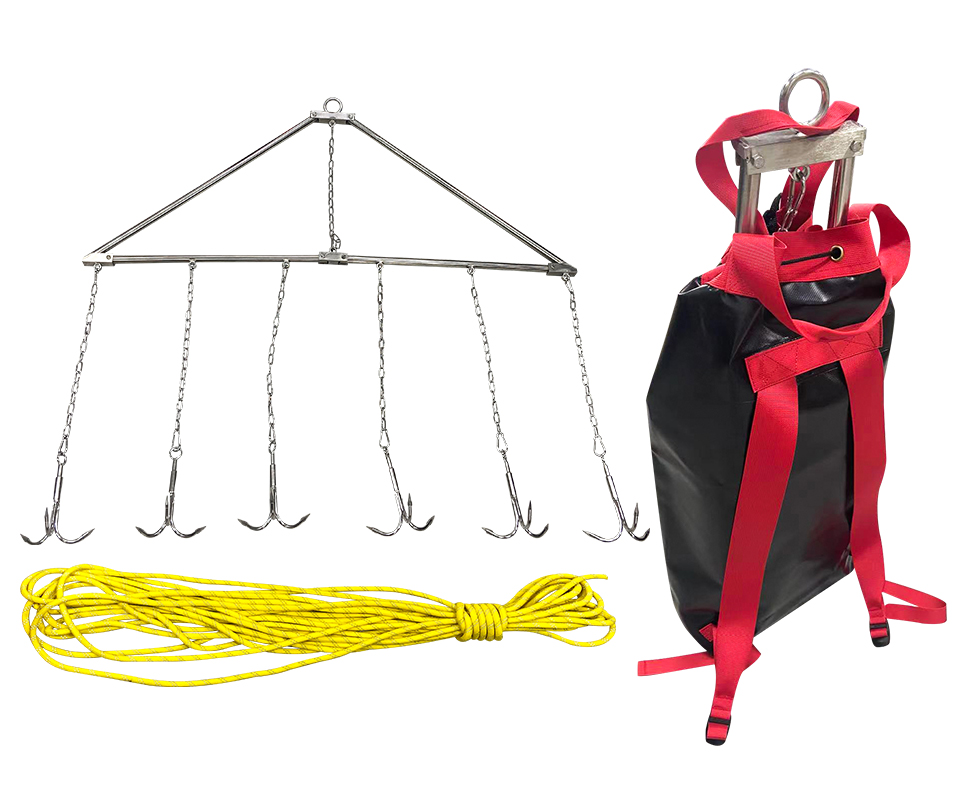 滚钩整体为不锈钢材质,钩体采用三爪锚钩,用于水下搜索溺水人员。整体三角可拆卸式,三角架经过静载荷性能测试:承重220KG。材质:304不锈钢材质;一套滚钩24 枚, 钩体:为三爪倒钩形式,钩体粗3mm、长度100mm,钩与钩间距15cm;主绳:长1500mm,直径12mm。