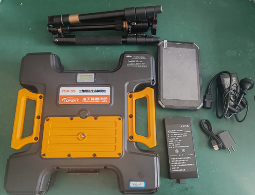 三维雷达生命探测仪由三维雷达探测器、操作终端(平板)、三角架、备用电池等组成。