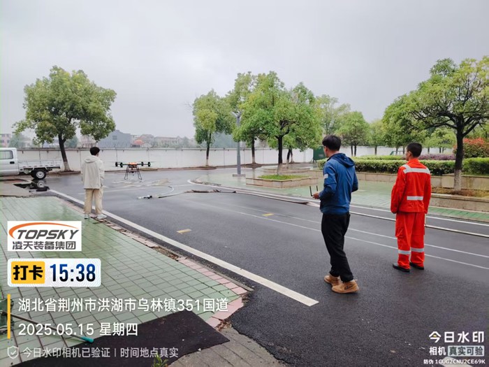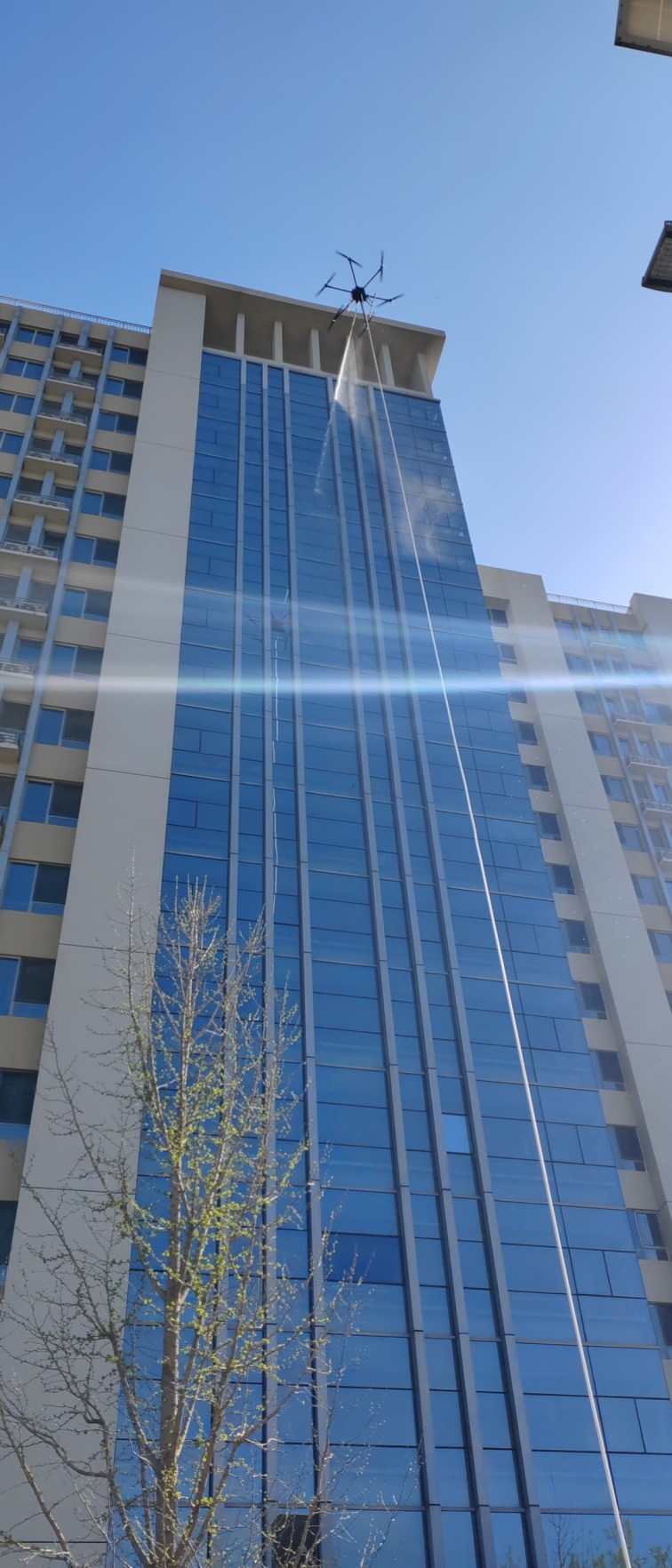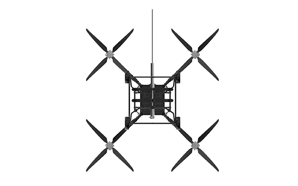 该无人机可装载在消防车上,能快速启动升空,通过特制高压水带与消防车水罐连接,消防车水罐内部高效泡沫/水基灭火剂输送到无人机平台,在水枪喷口水平喷射出去,达到灭火的效果。