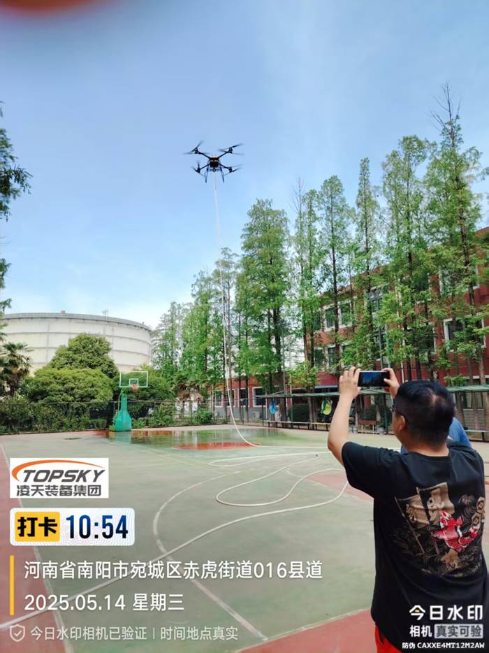LT-F50-MH陆空两栖高层建筑系留灭火无人机,是我公司针对城市高层消防需要而最新自行设计的,该无人机通过高空喷水灭火作业,充分实现了操作人员与火灾现场远距离分隔的优点,能很好地保护灭火人员的人身安全。该无人机具有结构新颖,性能稳定可靠,操作灵活,维修方便、喷水距离远、流量大等特点,同时,该无人机具备陆空两栖功能,可以在地面行驶。该无人机可装载在消防车上,能快速启动升空,通过特制高压水带与消防车水罐连接,消防车水罐内部高效泡沫/水基灭火剂输送到无人机平台,在水枪喷口水平喷射出去,达到灭火的效果。