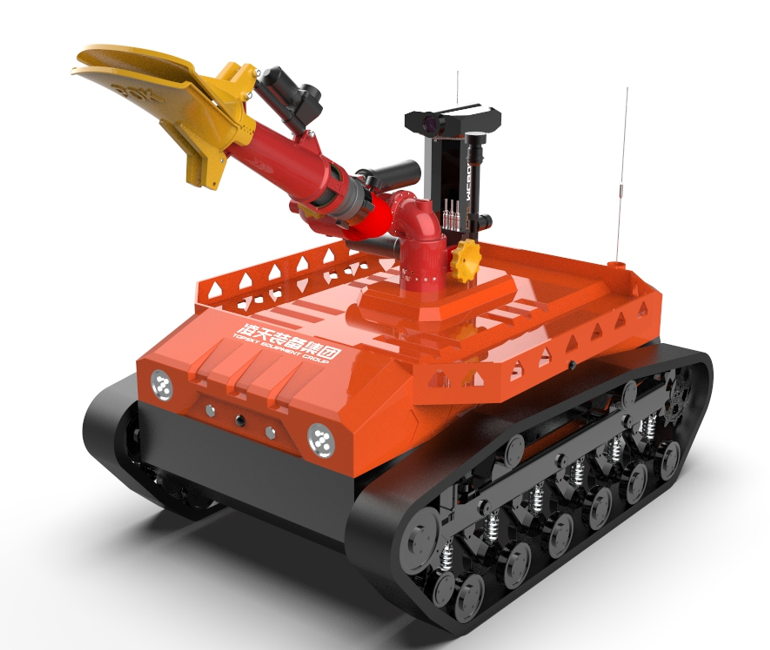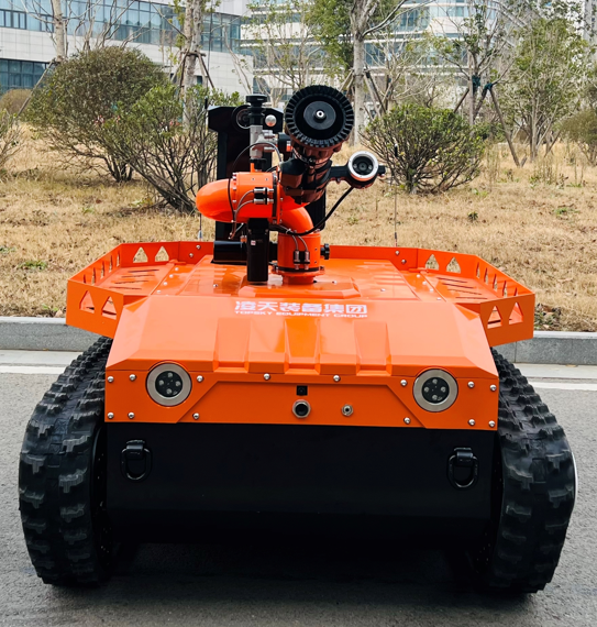 机器人采用无线遥控设计,遥控器与监视器一体/分离,可实时的显示电池、内部的各种信息,机器人状态、现场温湿度、有毒有害气体浓度报警信息等控制机器人前进、后退、转向等运动。具备远程侦察能力,机身搭建升降云台、高清摄像头、热成像摄像头、气体传感器三类环境感知设备和云台控制设备,也可联动声光报警模块提醒消防人员或群众,有效避免危险。在通过远程侦察手段有效获取现场火源信息后,机器人配备的大功率电机可以帮助消防人员将消防水袋拖拽至危险火源区域进行灭火,并能搭载各类国内、外的多种消防水泡,并能够远程控制发射水或泡沫。基于所配备的拾音模块和扬声器模块,拾取现场环境声音,即使消防官兵未靠近消防现场也能够听到搜救现场的群众呼救声,并通过扬声器模块与群众进行现场对话。