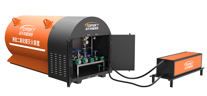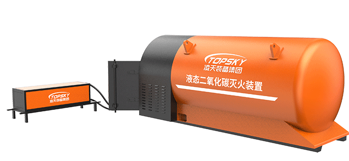 液态二氧化碳灭火装置,采用平板车为运载平台,搭载液态二氧化碳灭火模块,采用液态二氧化碳为灭火剂,运输至井下火区近附,经自增压调控系统实现罐内稳压,并通过远距离输送管路将液体从罐内向密闭火区喷射,利用其急速膨胀气化和吸热效率高的物理特性,可实现惰性降氧,吸热降温,吸附阻化等功能,从而可快速进行井下煤层自燃火灾的预防与扑灭等。