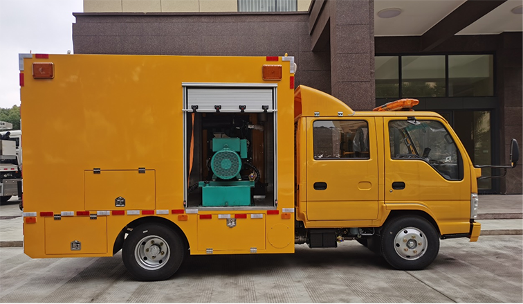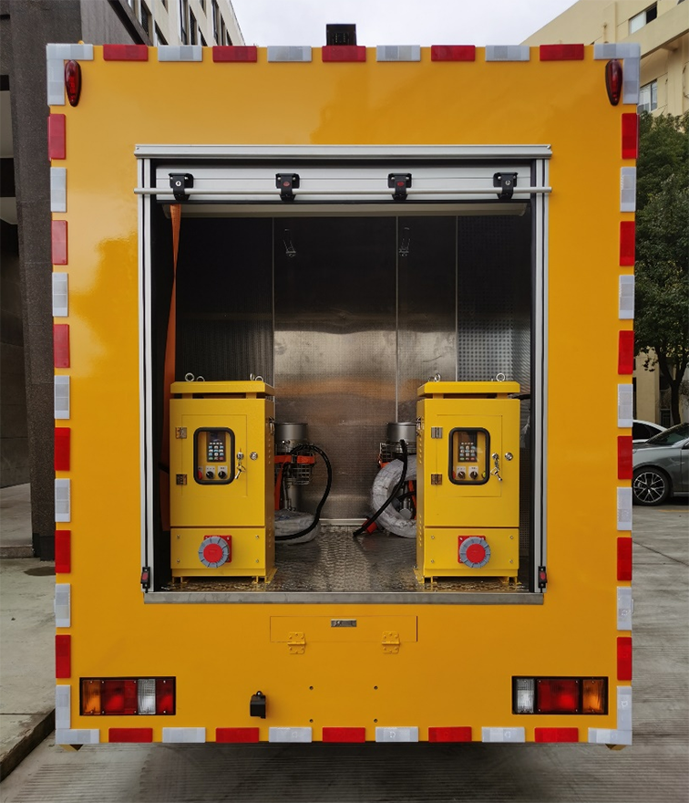双排座排涝车(1200m?),是在庆铃二类汽车底盘的基础上依据排水车的特点,配置柴油发电机组、两台大流量便携式潜水泵并整合照明设备等功能设计改装成型的专项作业车,整车尺寸较小,通过性较强,广泛适用于各类抢险现场。