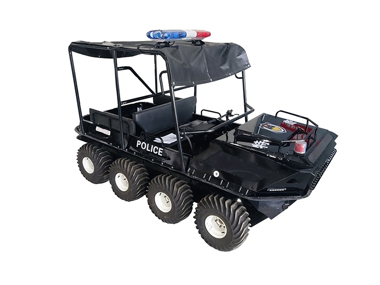 在复杂恶劣的地形条件和自然环境下,水陆两栖全地形车可以让搜救队员和携带的救援装备快速到达救援现场,减少徒步带来提供消耗,完成最后一公里最好五分钟紧急救援任务。水陆两栖全地形车可配备点到绞盘、救援担架组件、探照灯、警示灯、警报器、脱钩、破拆工具等装备, 给救援团队提供救援保障,更安全的解救伤员和疏散群众。