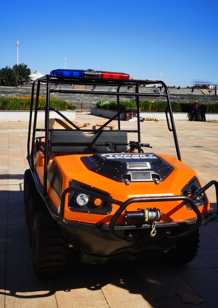 以完成可靠的野外应急救援为目的,该水陆两栖全地形车可提供一种安全的运输方式和可靠的运载平台,产品可以在山地环境、湿地环境、沼泽环境、水面环境、丛林环境等多种工作环境下,实现全天候连续作业。并且可以在灾害现场巡逻勘察、运送受伤人员、并有效实施援救。
