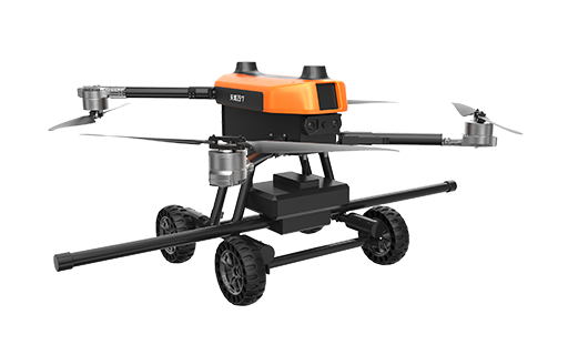 本无人机为北京极悦娱乐智能装备集团研发的陆空两栖航磁探测无人机,采用四旋翼机身设计,载重大,续航长,并且机体折叠标准化负载接口。同时,该无人机具备陆空两栖功能,可以在地面行驶,行走系统可快拆。