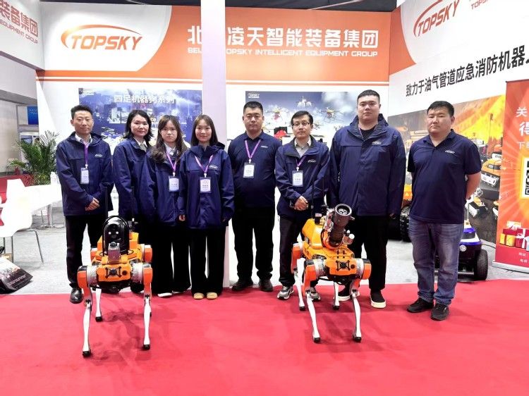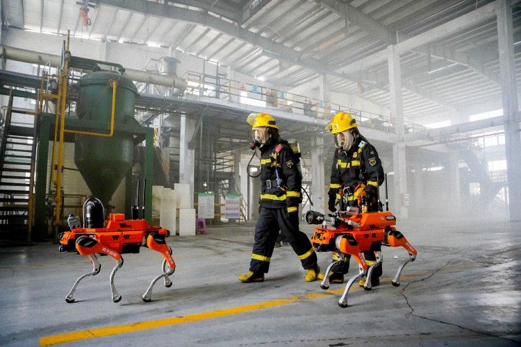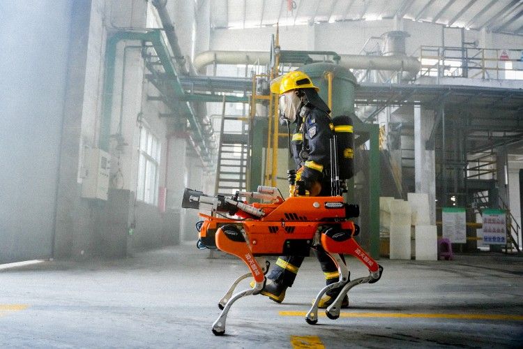 四足机器人搭载4D激光雷达,360°×90°半球超广角感知能力,超低盲点,可以做出跳跃、伸展、握手、高兴、跳人、坐下等手势; 内置长续航电池,满足消防侦察救援需求。