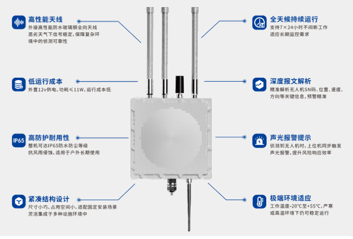 1.该产品是一款集成多种通信模式和能源供应的智能无人机探测设备,采用外置玻璃钢全向天线,可以对市面上常见消费级无人机实现精准预警;