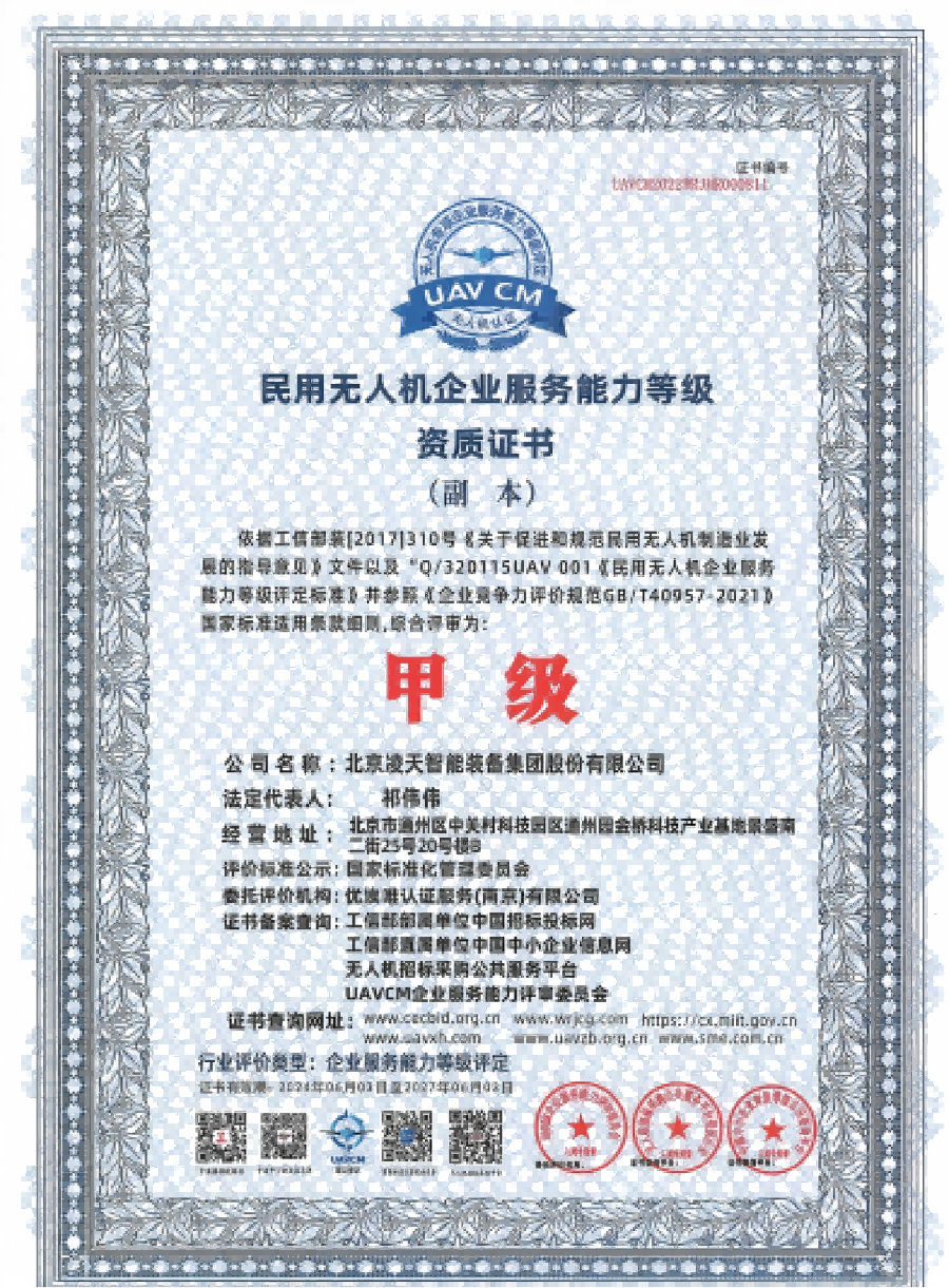 资格类 | 民用无人机企业服务能力等级资质证书(甲级) | |