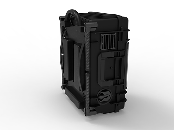供电系统为背负式系统,系留箱控制台配备LED照明系统;系留箱提供脚架折叠功能,在地面展开时可以避免与恶劣地面环境接触,从而保护系留箱;箱体可背负式设计,箱体材料采用环保材质,与人体背部贴合处符合人体工程学设计,舒适耐用,适合单兵长距离背负。