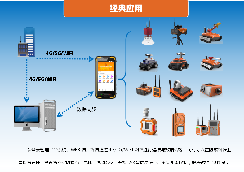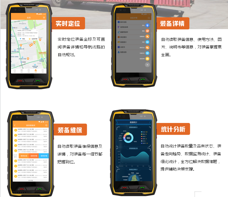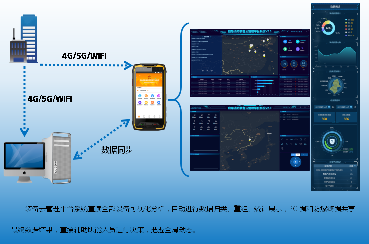 应急消防装备云管理平台系统能够直接通过职能人员手持的防爆终端,直接读取系统内所有的装备、设备及具体的详情、图片、位置、传输的数据,根据装备具有特性进行实时在线监测,当监测到的数据超标时,实时进行报警及查阅报警信息。该平台系统能够结合智能防爆终端本身功能、北斗定位/GPS定位、录像、拍照等进行信息存储,随时随地查阅装备库、维修库、报废库等级占比利用率分析,最终进行数据统计分析处理。此外该系统支持本地化业务拓展,如:现场监控、无线打印,保障此平台系统在不同环境中的应用与融合。