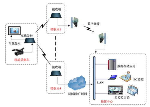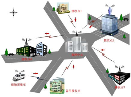 前端现场采集车安装大功率车载设备在城市各区内巡逻,实时将采集的音视频信息传给就近接收点,接收点用微波、光纤或专网等设施传输给指挥中心。