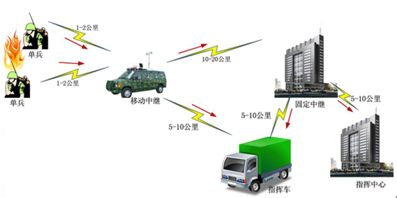 可做单兵发射-指挥监控车或单兵发射-指挥监控中心等应用。